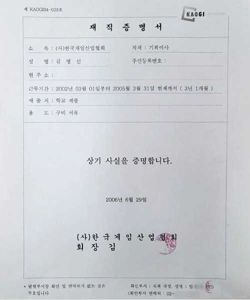 それだけでなく、在職証明書の上段左側に記された「チェKAOGI04-029号」という文書番号も怪しい。「KAOGI」というアルファベットは韓国ゲーム産業協会の略で、その後ろに来る数字は年度、その次の数字は同年に発給された公文書のナンバリングである。しかし、2006年6月29日に発行された在職証明書に、「04」と記載されているのは何故なのだろうか。