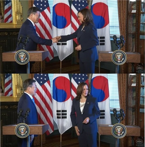 米韓首脳会談のためにアメリカを訪問した文在寅(ムン・ジェイン)大統領と握手した後、手を拭う姿を見せたカマラ・ハリス米副大統領の行動が批判を受けている。