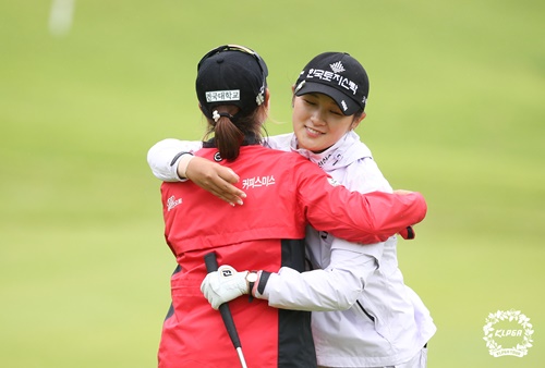 (写真提供=KLPGA)試合後、イム・ヒジョンと抱き合うパク・ヒョンギョン(右)
