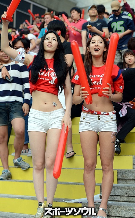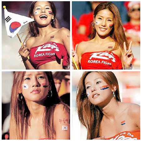 韓国ユニフォームの象徴である赤いTシャツや太極旗(韓国国旗)のフェイスペイントをして、勝利を願う。特に魅力溢れる女性は、“サッカー応援美女”として注目を集めてきた。