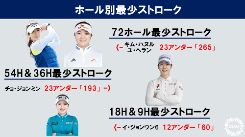 また、イ・ジョンウン6は第2ラウンド前半で8アンダーの「28」を記録したため、「9ホール最少ストローク」でもタイ記録を樹立している。