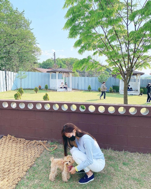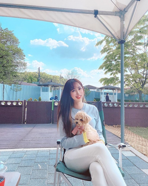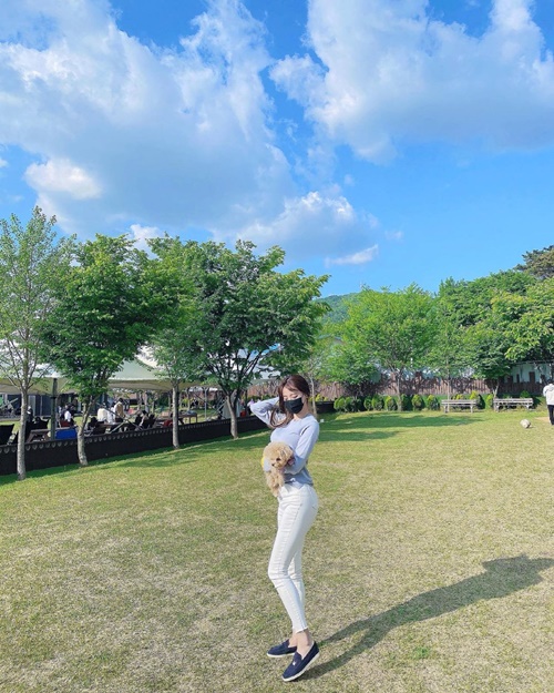 写真を見ると、晴天の屋外で愛犬のコミと戯れるキム・ハンナの様子が写っている。印象的なのは白スキニーから伝わる美脚で、チアリーダーらしく引き締まったレッグラインが見る者を魅了した。