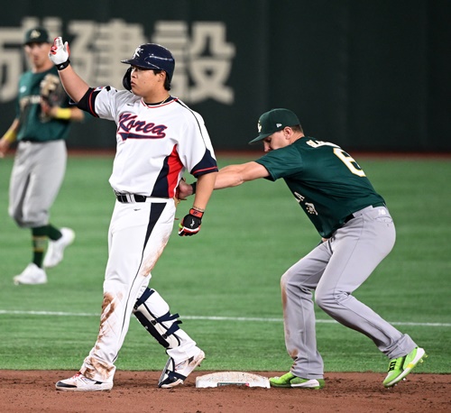 この隙を狙い、ボールを保持していたオーストラリアの内野手が素早くカン・ベクホをタッチ。一度はセーフだったが、オーストラリア側のビデオ判定の結果、タッチアウトに覆された。