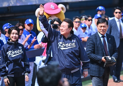 ユン大統領は韓国野球委員会(KBO)のホ・グヨン総裁の案内を受けてマウンドに上がり、主審から球を受け取ると、ダイナミックな投球フォームで球を投げた。