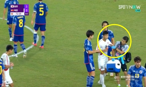北朝鮮は0-1でリードされていた後半28分頃、日本代表のスタッフが選手たちに水を配っていたところ、DFキム・ユソンがスタッフを殴ろうとするジェスチャーを取った。これに日本の選手たちが抗議すると、キム・ユソンはこれ見よがしに睨みながら水を飲んだ。その後、主審はキム・ユソンにイエローカードを提示した。