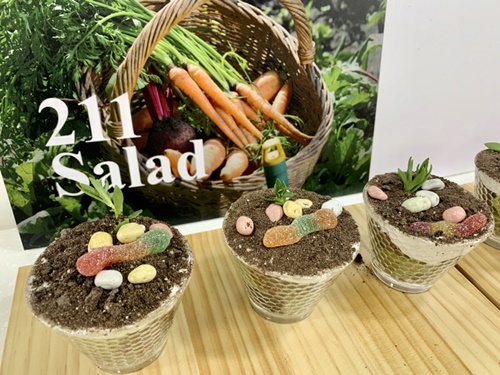 だが、これはエイプリルフール。ミニ植木鉢は本物ではなくカップケーキで、抹茶カステラの上に粉末状のチョコレート菓子とゼリーを載せて土や石を表現。トッナムルで草を表した。