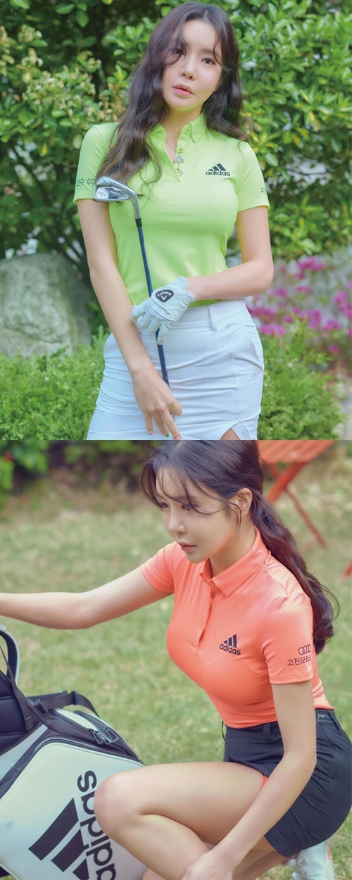 写真の中のアン・シネは、ライトグリーン×ホワイトやライトレッド×ブラックと春らしいゴルフウェアのコーディネートでポーズを取っている。