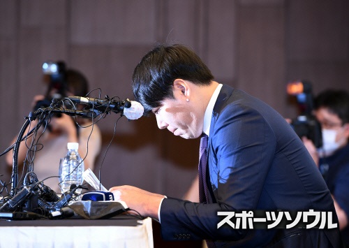 正装で記者会見に臨んだカン・ジョンホは、頭を90度下げて謝罪の意を示した後、用意した謝罪文を発表した。