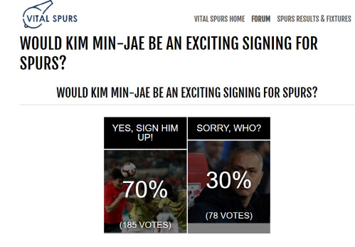イギリスメディア『VITAL FOOTBALL』内『VITAL SPURS』は、7月17日(日本時間)にトッテナムのキム・ミンジェ獲得に関するアンケート調査を実施した。