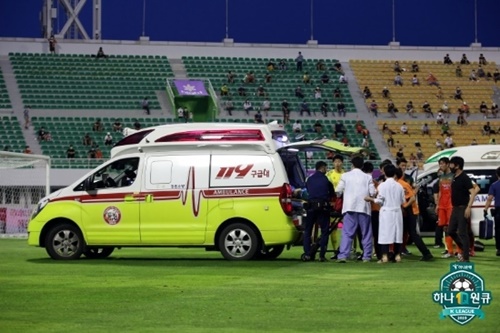 (写真提供=韓国プロサッカー連盟)救急車に乗せられるハン・グギョン