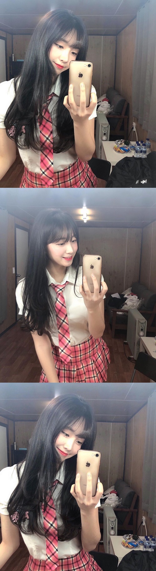 写真を見ると、制服姿のアン・ジヒョンが鏡に映る自身の姿をカメラで収めている。ピンクを基調にしたチェック柄のスカートやネクタイが彼女のかわいさを一層引き立てるほか、制服を着ていても伝わるスタイルの良さが目を引く。