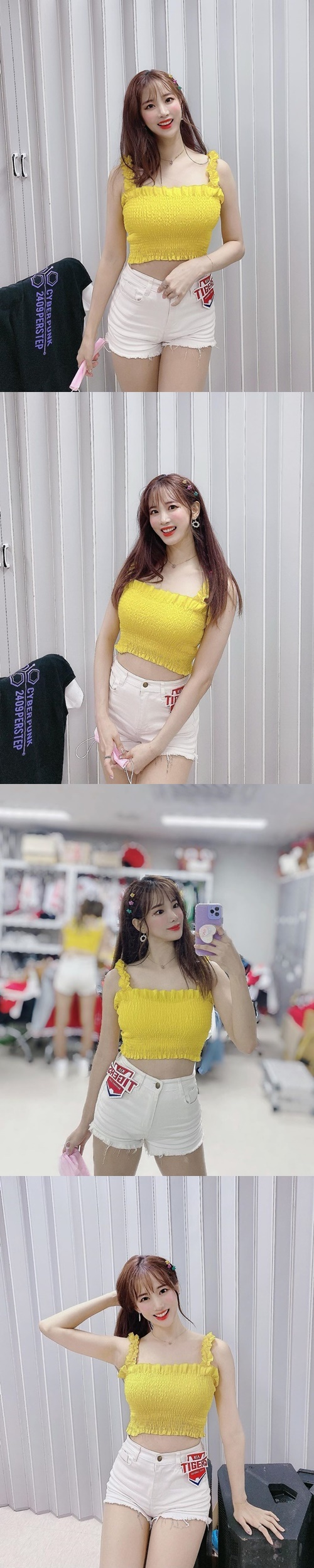 黄色のフリルキャミソールに白のホットパンツのコーディネートで、カメラに向かってポーズを取る自身の写真を数枚投稿した。