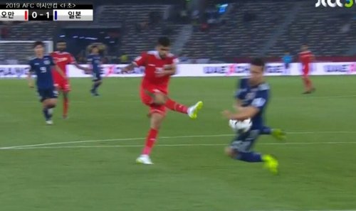主審はハンドの反則を宣言した後、オマーン代表にペナルティーキックを与えてもおかしくない場面だった。むしろホイッスルを吹くのが正しいように見えた。ハンドの反則が成立する最大の根拠である故意性が見受けられたからだ。