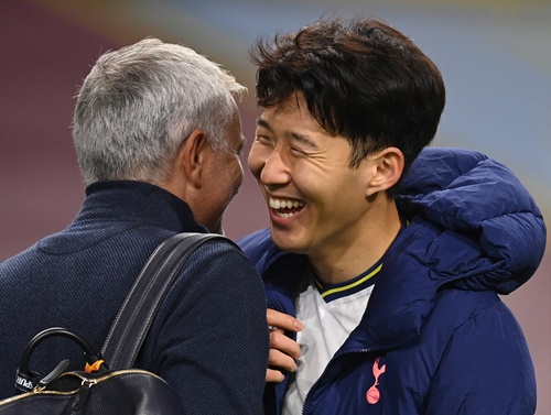 (写真提供=代表撮影/ロイター/アフロ)バーンリー戦後、ジョゼ・モウリーニョ監督と抱擁するソン・フンミン(右)