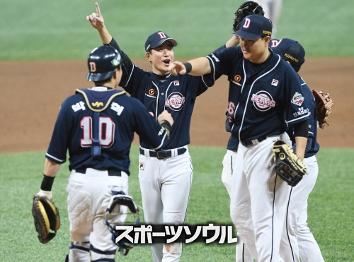 韓国シリーズ第2戦に勝利し、喜ぶ斗山ベアーズの選手たち