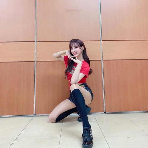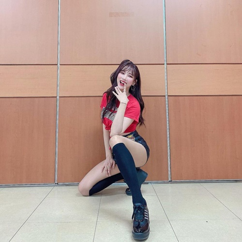 写真を見ると、チアリーディングの衣装に身を包んだキム・ハンナが、カメラに向かって片ひざをついたポーズを披露している。ホットパンツからスラリと伸びた美脚はさることながら、指を口に当てて満面の笑顔を見せる姿が印象的だ。
