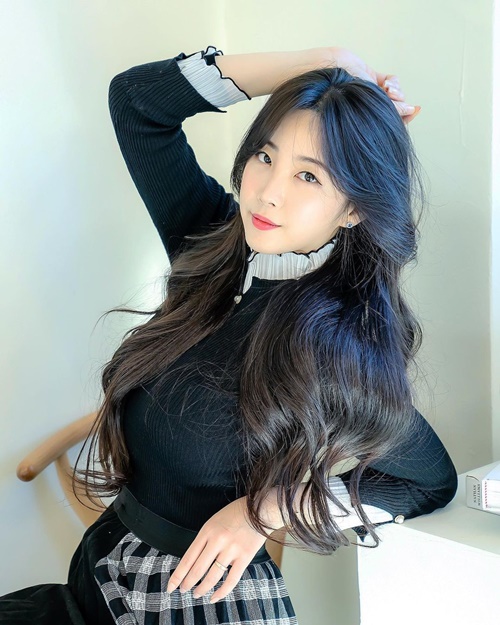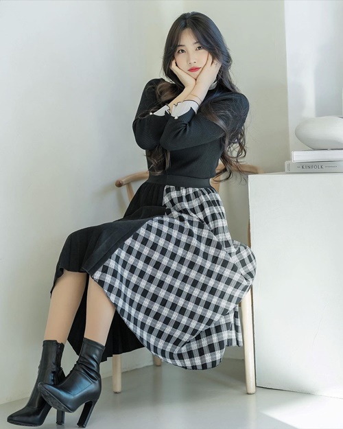 写真を見ると、黒色のニットにチェック柄の入ったロングスカートとハイヒールブーツを合わせたアン・ジヒョンが写っている。右手を頭の上に乗せたり、両手を顎の下に添えてみたりと、キュートさあふれる多彩なポージングで見る者を魅了させた。