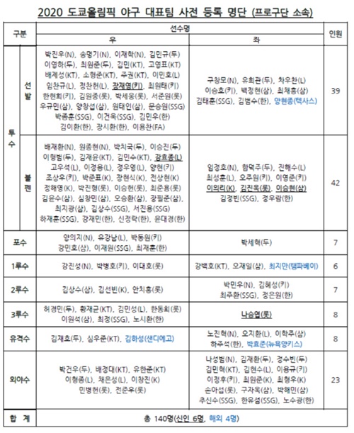 韓国野球委員会(KBO)は3月19日、東京五輪の男子野球代表事前登録者リストを大韓野球ソフトボール協会(KBSA)に提出した。6月に確定される最終メンバー24人は、同日提出されたリストから選抜される。