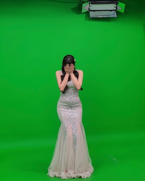 写真を見ると、グリーンバックを背景にポーズを見せるアン・ジヒョンが写っている。ボディラインがくっきり強調されたドレス姿が特徴的で、メリハリある曲線美が見た者を虜にして見せた。