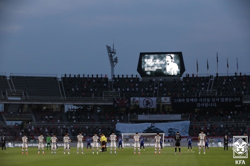 (写真提供=韓国サッカー協会)試合前、ユ・サンチョルさんに黙祷をささげる両チーム