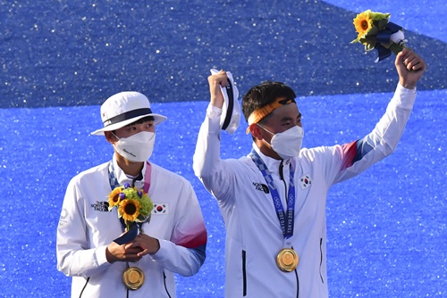 韓国のアン・サン(20)とキム・ジェドク(17)は7月24日、東京の夢の島公園アーチェリー場で行われたアーチェリー混合団体決勝でオランダと対戦し、セットポイント5-3で勝利。韓国勢で第1号となる金メダルを獲得した。