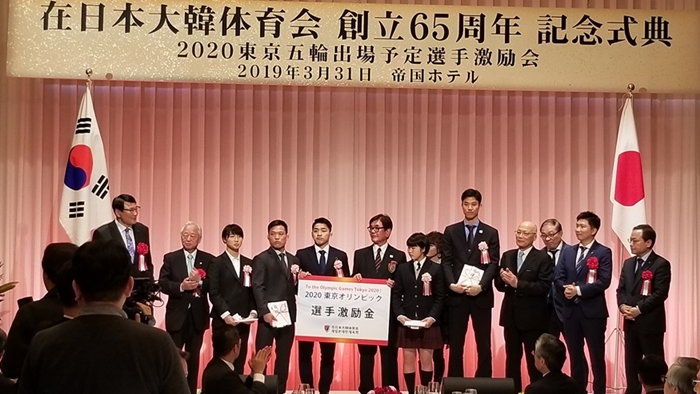 また、安昌林(アン・チャンリム=男子柔道)、金琳煥(キム・イムファン=男子柔道)、許海実(ホ・ヘシル=女子柔道)、金知秀(キム・チス=女子柔道)、金秀範(キム・スボム=男子テコンドー)ら、2020年東京五輪出場を目指す在日コリアン・アスリートたちにエールを送る激励会も行われ、選手たちには在日本大韓体育会の崔相英(チェ・サンヨン)会長から激励金も贈られた。