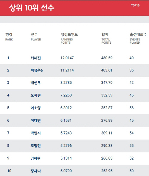 (画像=KLPGA)Kランキング、現在のトップ10