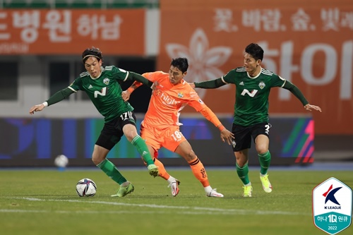 (写真提供=韓国プロサッカー連盟)全北現代の邦本宜裕(左)
