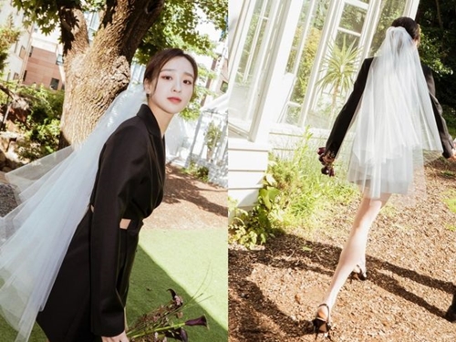 ソン・ヨンジェは白のベールを被って短いブラックスーツドレスを着ている。純白のドレスがメジャーなウェディングカットとは一風異なり、洗練された雰囲気だ。