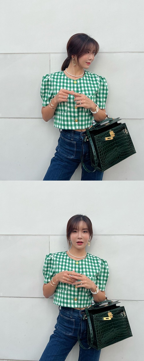 緑のギンガムチェックのトップスにデニムを合わせたコーディネートで、カメラに向かってポーズを取っている。