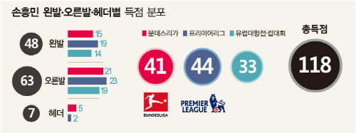 ソン・フンミンの記録をひもとくと、彼の真価が一層際立つ。主には利き足である右足で63ゴールを決めているが、左足でも48ゴールを決めており、左利きの選手にも勝るプレーを見せている。