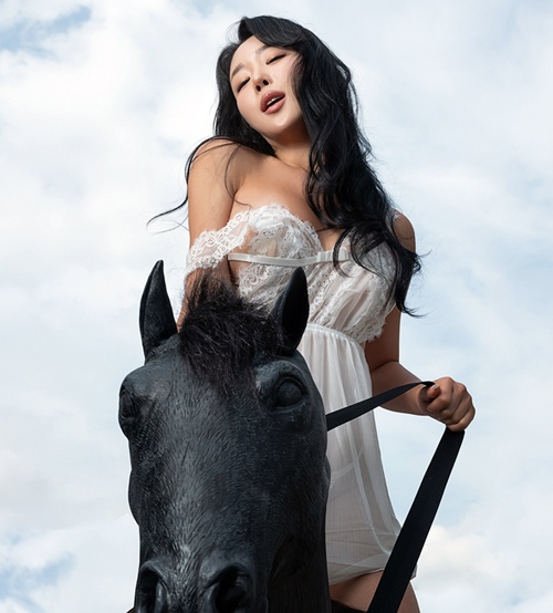レースのシースルーワンピース姿で馬にまたがるショットは『愛馬夫人』を彷彿とさせ、韓服のチョゴリにベージュランジェリーを合わせたスタイリングでは『ポン』の象徴的なイメージを再現した。