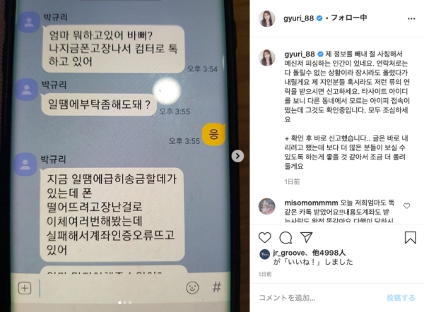 母のスマホを借りてこのトーク画面を撮影し、詐欺被害の事実を知らせたパク・ギュリは、「もしこのような連絡をもらった私の知人がいれば、通報してほしい」と注意を促した。