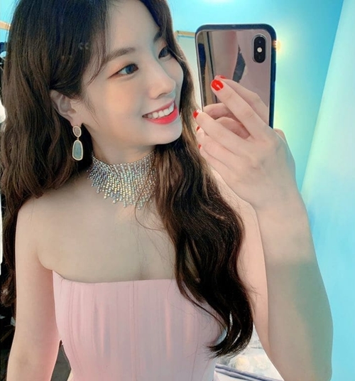 写真の中のダヒョンは、ピンク色のドレスに身を包んでいる。華やかなアクセサリーや、片方だけ肩に流したロングヘアは、いつものキュートな雰囲気とは異なる艶やかさを感じさせる。
