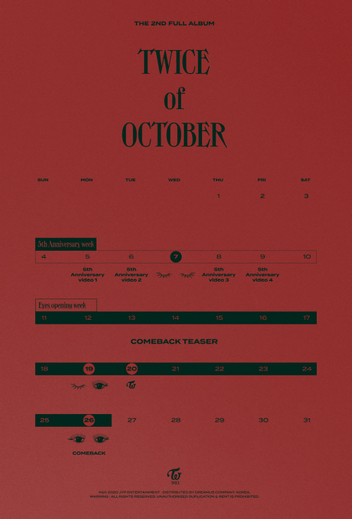 JYPエンターテインメント(以下、JYP)は10月1日、TWICEの公式SNSチャンネルにカムバックスケジュールが記されたティーザーイメージを公開した。