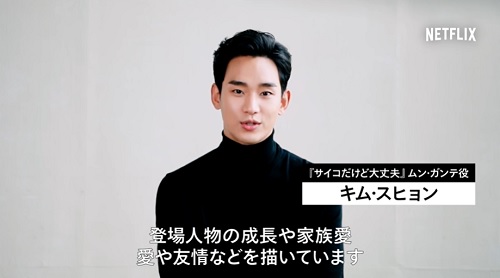 続いて登場したキム・スヒョンは、「登場人物の成長や家族愛、恋愛、友情などを描いています」と『サイコだけど大丈夫』について説明し、「この作品を通じてみなさんが癒されればと思います」と話した。また「日本のファンの皆さんに早く会いたいです」と付け加えた。