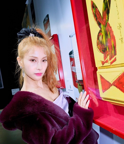 写真の中のギュリは、ハイトーンのロングヘアを高い位置でポニーテールにしている。鮮やかな紫のファージャケットもまた、ギュリの美しさを引き立てているようだ。