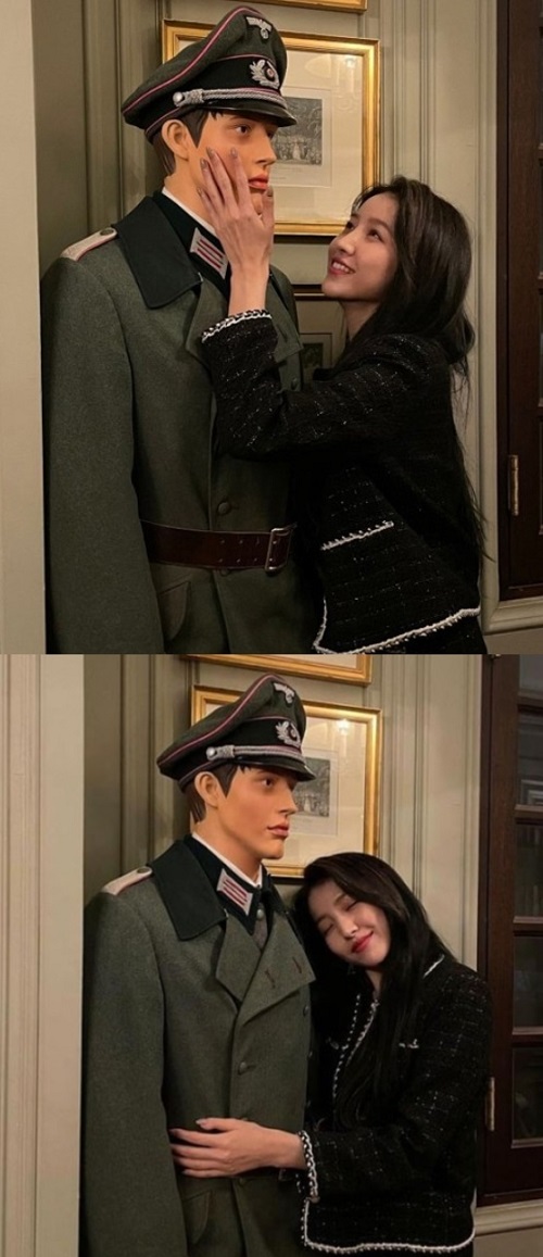 ソウォンは去る1月30日、インスタグラムに数枚の写真を投稿した。軍服を着たマネキンと一緒に撮った写真で、ソウォンがマネキンの頬に手を置いたり、抱きついたりしている。