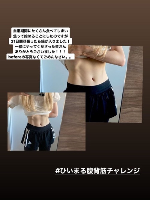 8月31日午後、本田仁美はインスタグラムのストーリーに、「隔離期間に食べすぎてしまい、焦って始めることにしたのですが31日間頑張ったら線が入りました!」と報告。