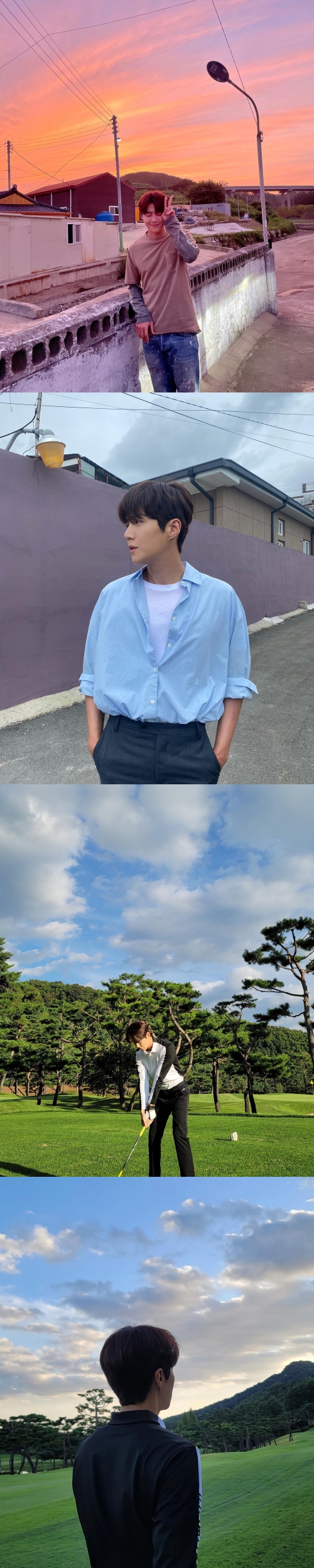 別の写真では、ブルーのシャツを爽やかに着こなすキム・ソンホが写っている。端正な目鼻立ちが完璧なEラインを完成させた。