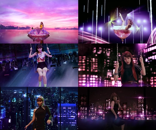 2つ目は、モモが高層ビルを背景にブランコを漕ぐシーン。3つ目はミナが黒い衣装に身を包み、都会の夜景を背景に踊るシーンだ。