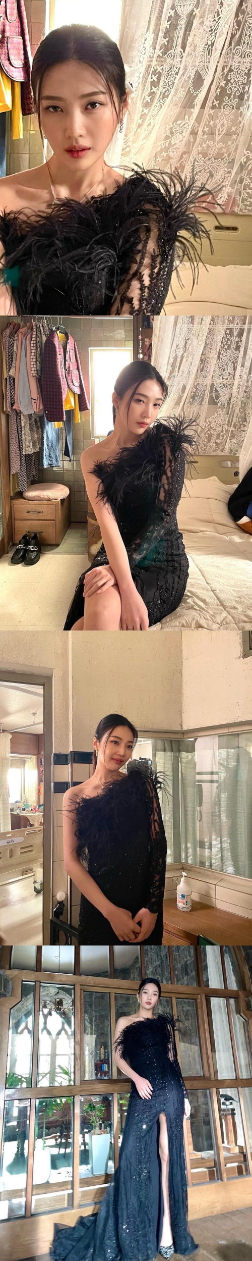 髪は一つにまとめ、グッと大人びた表情が印象的だ。ジョイは黒のフェザードレスを着用。太ももまで深くスリットが入り、腕の部分はシースルーのデザインとなっている。