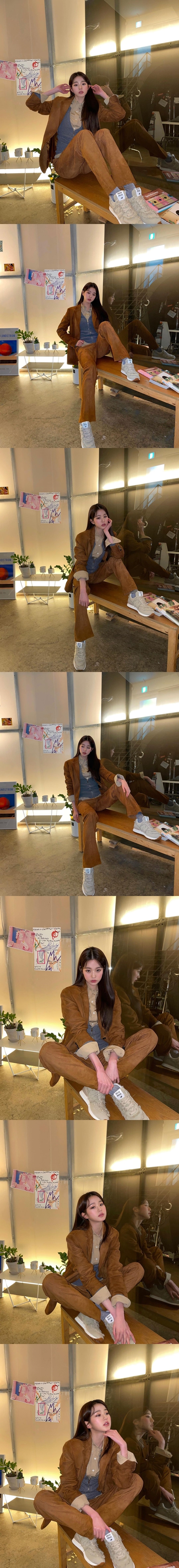 写真の中のウォニョンは、NewBalanceとMiuMiuがコラボしたベージュのスニーカーにブラウンスーツを合わせ、かっこよく着こなしている。