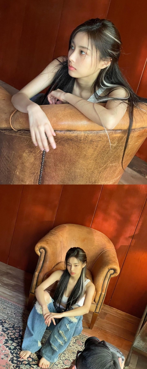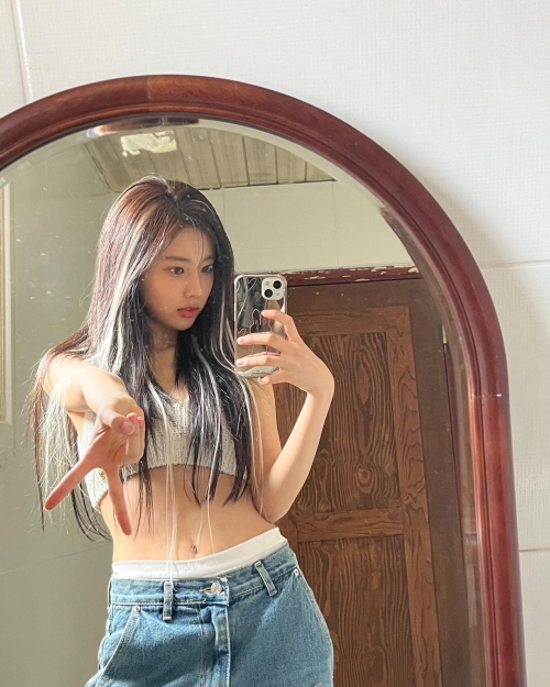 写真には、鏡の前で自撮りをするカン・ヘウォンの姿が写っている。スマホの画面を見つめながら、今流行中の“ギャルピース”を披露しているカン・ヘウォン。無造作に降ろされたロングヘアからは、地毛の間からエクステヘアが見える。普段よりもクールなビジュアルでファンを魅了した。