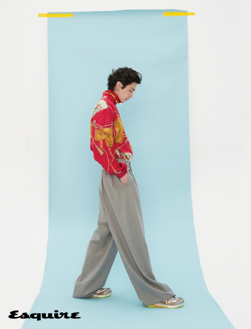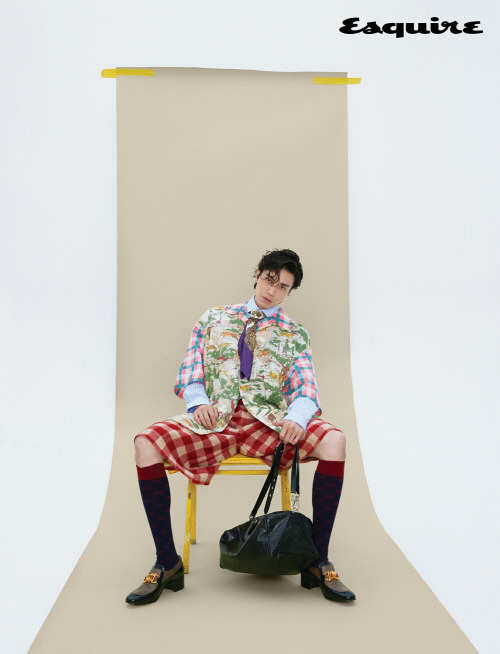 イ・ドンウクは今回の撮影で、意図的に華やかな柄物アイテム同士を合わせる“タッキースタイル”を披露。難易度の高いコーディネートも難なくこなして目を引いた。無造作にまとめられた前髪の隙間から除く強い眼差しもまた、印象的だ。