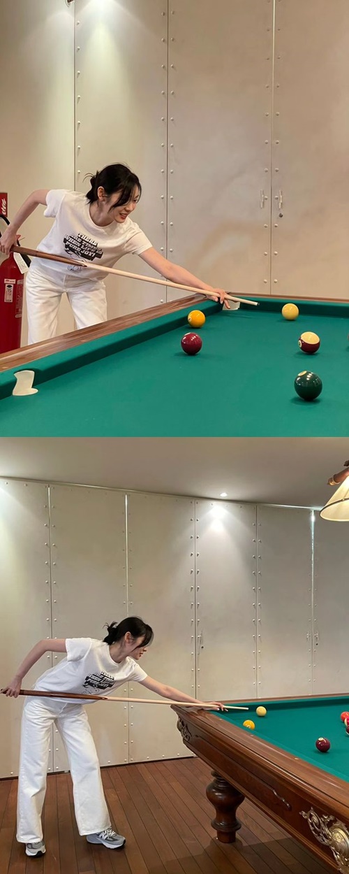 写真を見ると、屋内でビリヤードをする様子のキム・ヨナが写っている。半袖Tシャツにスニーカーというラフなコーディネートで、にこやかな表情で楽しむ姿が印象的だ。