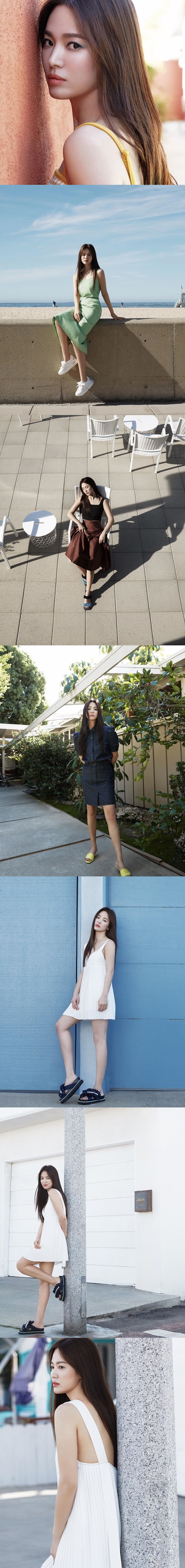 写真の中のソン・ヘギョは、明るい日差しの下で透明感あふれる素肌を惜しみなく見せている。多種多様なカラーとデザインのワンピースとエレガントなシューズは、その美しさを一層引き立てた。