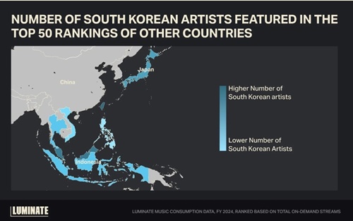ルミネートは「海外市場に進出しているアーティストの数が多く、優れた成果を上げているアーティストを擁する国が高いスコアを得る」と説明したうえで、K-POPを主に輸入する国は、日本、台湾、インドネシアなどであることが判明した。