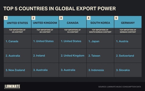 これは、音楽輸出分野において韓国がアメリカ、イギリス、カナダに次いで4番目に強い影響力を持っていることを意味する。