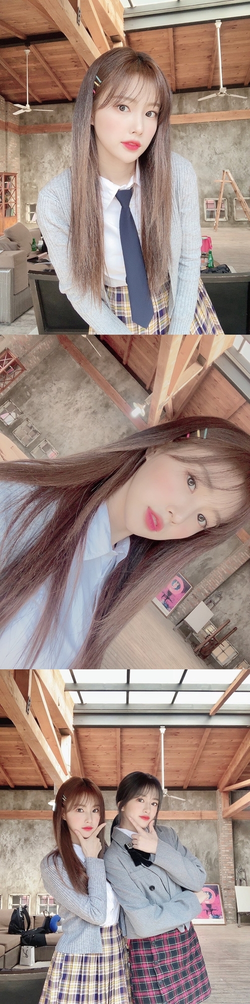 続いて、リンクコーディネートで爽やかな魅力を披露したのは、カン・へウォンとアン・ユジン。互いにグレーのカーディガンとジャケット、色違いのチェックスカートでテイストを合わせ、端正な着こなしで見る者を惹きつけている。